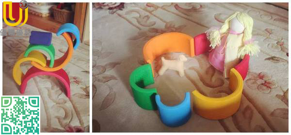 在这个基础只上,我们创造出新的玩法,依据形状和颜色来分类:搭一座蓝色的房子(不同形状、相同颜色);或一列彩虹色车厢的火车(不同颜色、相同形状)。家长可以跟宝宝轮流玩,一人“出题”,一人找出相应的形状或颜色,然后一起完成。宝宝很喜欢这样有些小挑战的玩法。